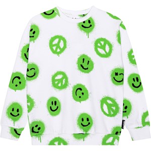 White sweatshirt with a green and black, all over print in 100% organic cotton. The print is of a lot of spray painted peace signs and smiling faces that are spreading the message of 'More Love'. The sweatshirt is in a regular fit and has a round neck with a rib edge as well as rib at the sleeves and bottom.