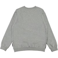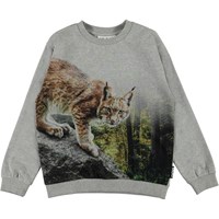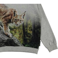 Miksi is a grey sweatshirt with a print of a linx on a cliff on the front. It has a round neck and elastic rib at the bottom and the sleeves.