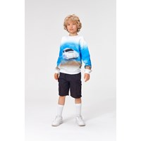 The "White Car" print on the Miksi sweatshirt shows a white race car, zooming out of the fog, almost bursting off the top. Miksi has rib at the neck, wrists and waist.