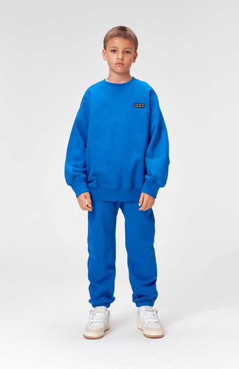 Mir is a blue sweatshirt with a black embroidered patch at the left side. Mir has raglan sleeves and rib at the neck, wrists and waist.