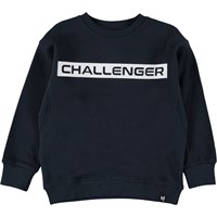 Mons is a dark blue sweatshirt with darts at the sides and a round neck. The front has the text 'Challenger'.