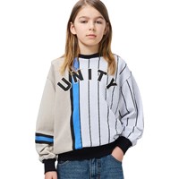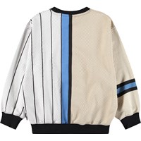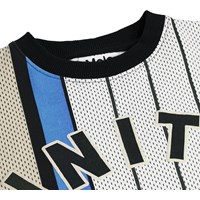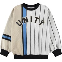 White and beige sweatshirt made of soft, organic cotton with black ribbed edges at the neck, sleeves, and bottom. The sweatshirt has a loose and relaxed fit with a sporty basketball-inspired look and the text 'Unity' on the front.
