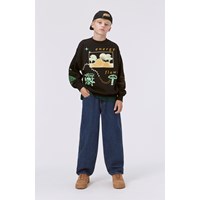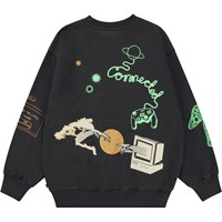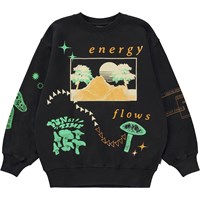 Black sweatshirt with a graphic print in clear colours. The print is designed as a graphic collage, inspired by the blurred line between the real world and the virtual world. ”Energy Flows” focuses on the similarities rather than the differences between these two worlds. You find elements inspired by computer graphics like pop-up windows, 3D specs but also pictures of real trees.