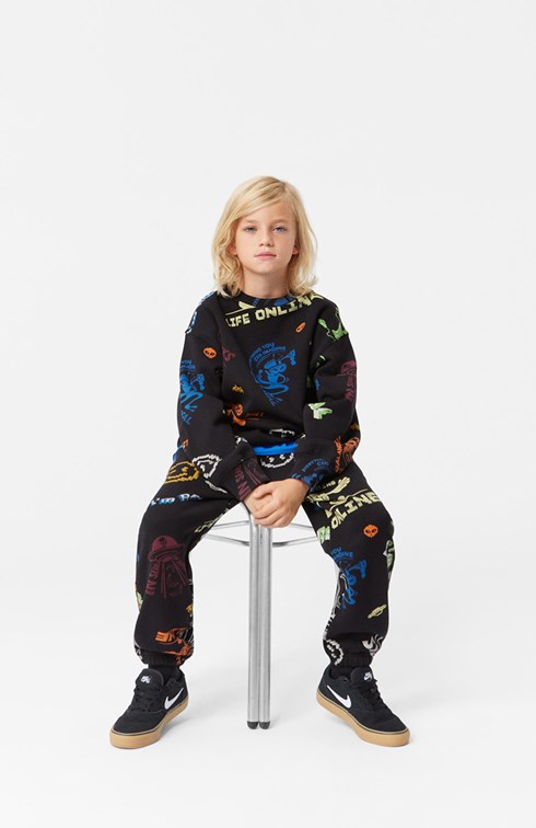 Black sweatshirt made from organic cotton with a brushed inner face, making it soft and warm to wear. The sweatshirt has a loose fit, long sleeves, a round neckline with ribbed trim, and an all-over print featuring various coloured comic characters, such as an Alien searching for snacks and beaming bananas up in its UFO, a cat with a computer screen for a head, looking at a computer mouse, and an alien wearing a VR headset. A lively pattern with lots of fun details.