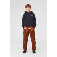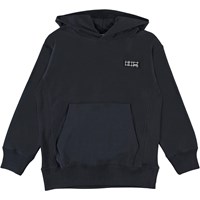 Moz is a dark blue hoodie with a pouch pocket on the front and a molo logo on the chest.