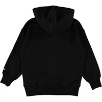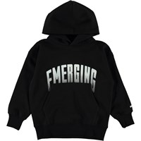 Moz is a black hoodie with "Emerging" text and a pouch pocket on the front.