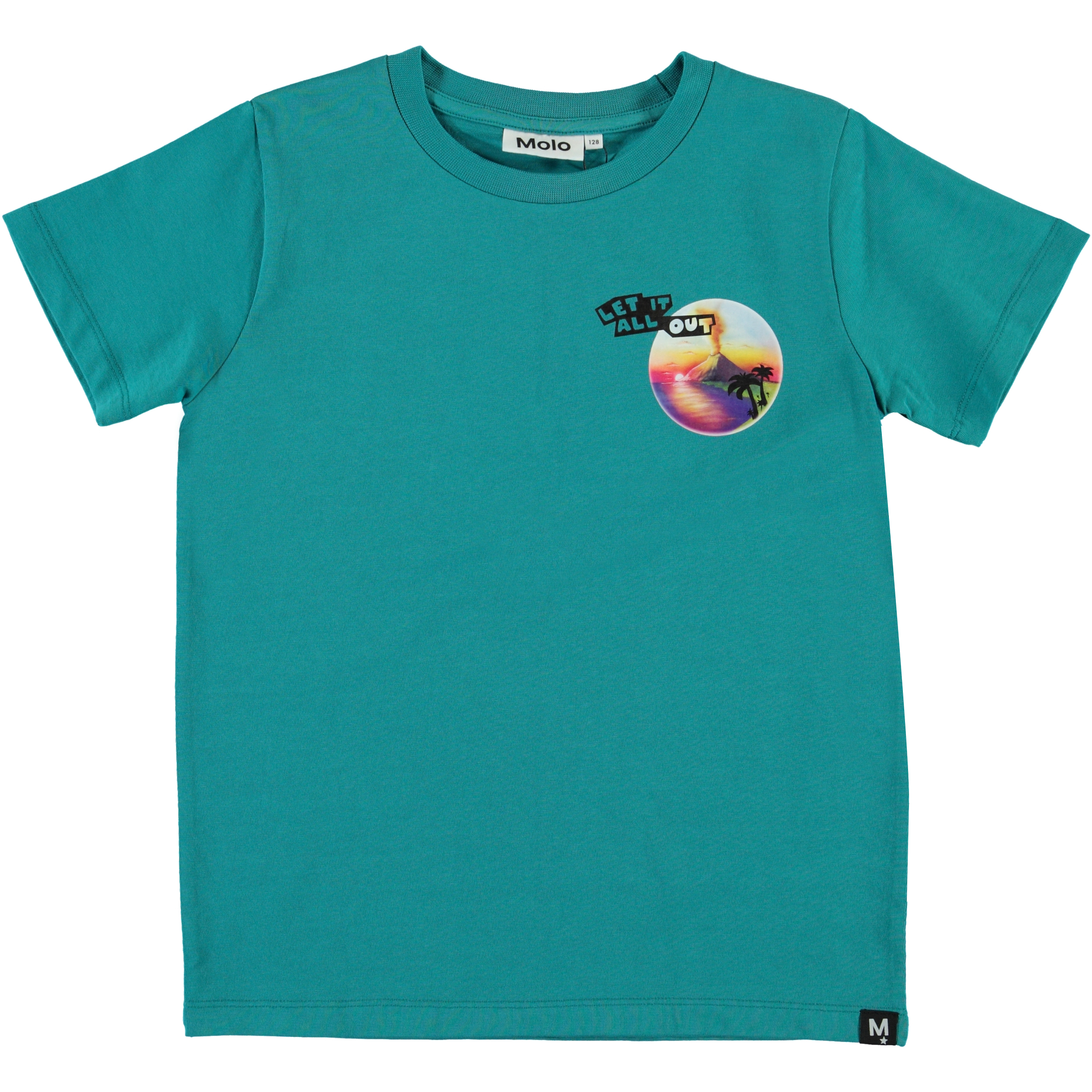 Raddix is a turquoise t-shirt with a volcano print on the left chest. Raddix is 100% cotton and has short sleeves.
