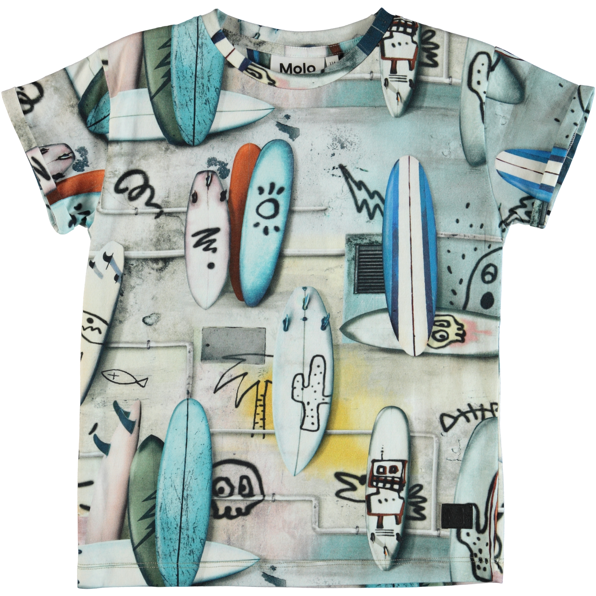 Rafe is a t-shirt with the 'Summer Walls' print, which is full of surfboards and cool grafitti.