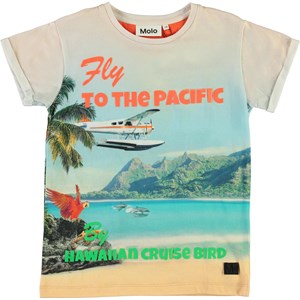Fly over the Pacific Ocean and enjoy the sight of the dolphins on the Rafe t-shirt. The t-shirt is 100% cotton and has roll up sleeves. Certified by Ecocert Greenlife, certification no. 197496.