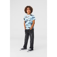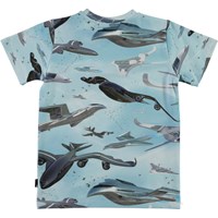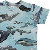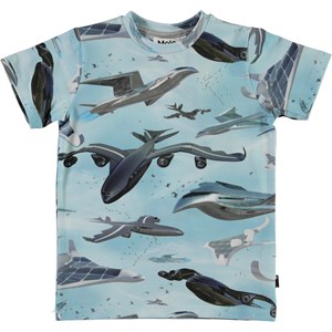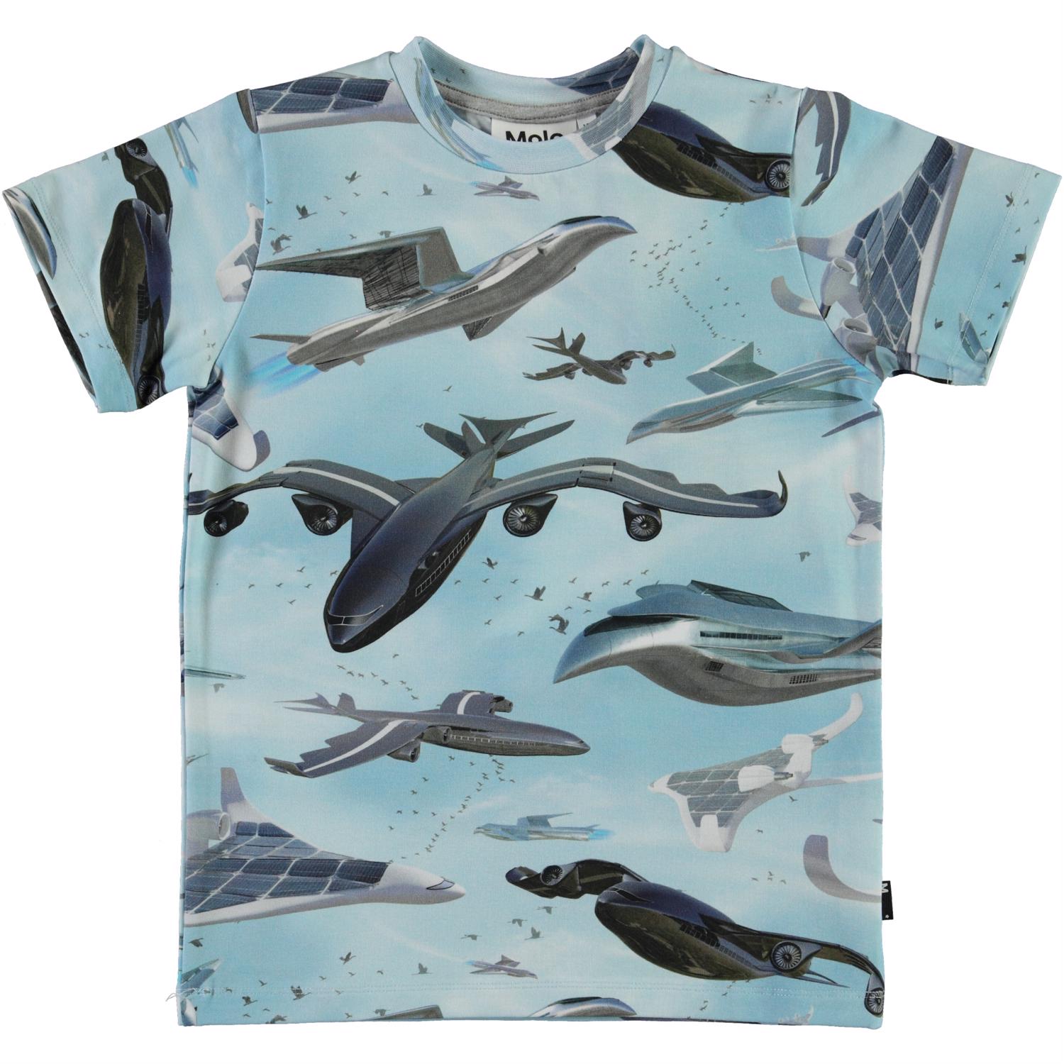 Ralphie is a light blue t-shirt with an all-over print of an airplane. The t-shirt has a round neck.