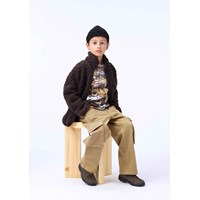 T-shirt made of soft organic cotton with a ribbed neckline. The T-shirt is slim fit and has a print of running animals on the Savannah in golden and brown shades.