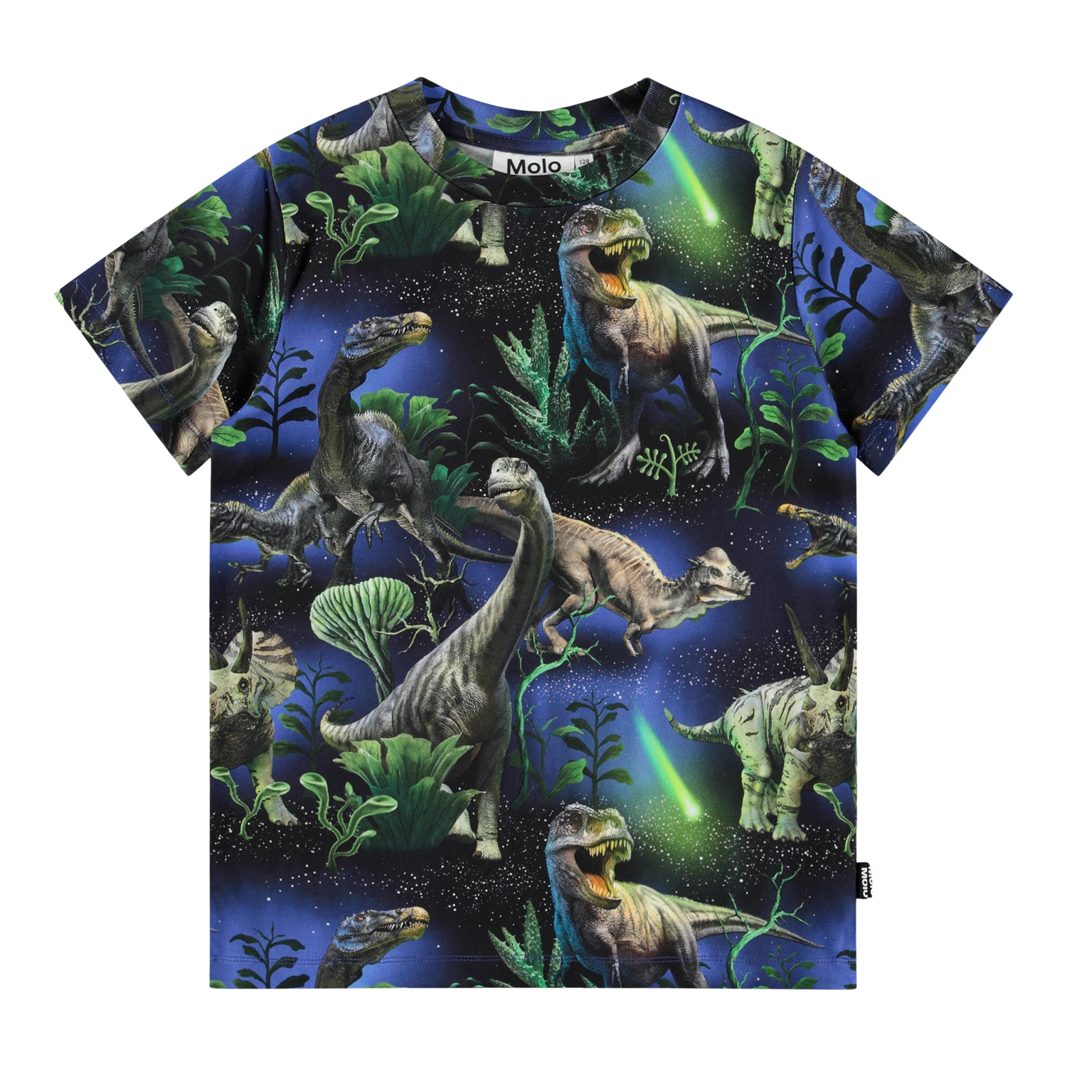 Blue and green T-shirt made of soft organic cotton with a ribbed neckline. The T-shirt is slim fit and has a print of dinosaurs under a beautiful starry sky.