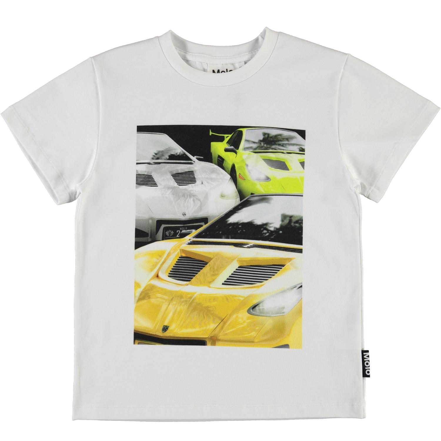 Rame is a white t-shirt with a print of cool, fast cars on the front.