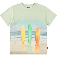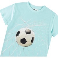 Light blue t-shirt in soft organic cotton with ribbed neckline. The t-shirt has a loose fit with a front print of a flying football into the goal.
