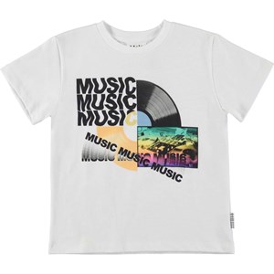 Rame is a white t-shirt with the "Musik Collage" print. It's a collage of music, LP's and mixes as a tribute to music.