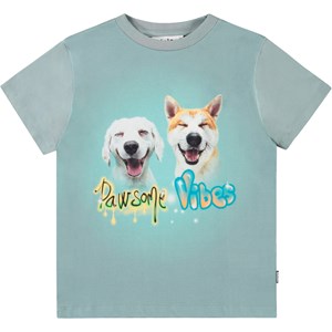 Blue t-shirt in soft organic cotton with ribbed neckline. The t-shirt has a loose fit with a front print of two smiling dogs and the text 'Pawsome Vibes'.