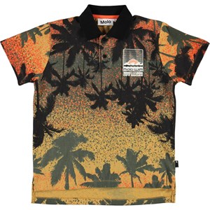 Ramon is an orange and green polo t-shirt with a print of palm trees and a graphic sunset. The t-shirt has a black collar and button closure. It is in 100% cotton.