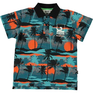 Ramon is a blue polo t-shirt with a print of palm trees and a red sunset. The t-shirt has a black collar and a button closure. It has a retro Hawaii print on the chest and is in 100% cotton. Certified by Ecocert Greenlife, certification no. 197496.
