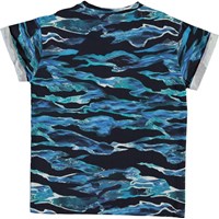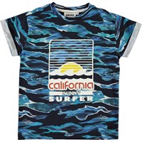Randon is a blue t-shirt with a wave print that looks like camouflage. The t-shirt has a retro 'California' print on the front and roll up sleeves. The t-shirt is in 100% cotton. Certified by Ecocert Greenlife, certification no. 197496.
