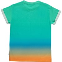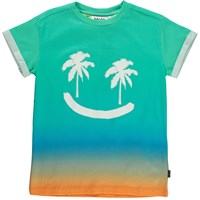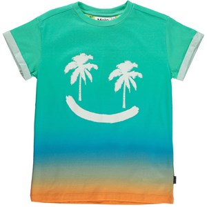 Randon is a tie-dye rainbow t-shirt with rolled up sleeves. The t-shirt has a print of a smiley face wtih palm tree eyes.