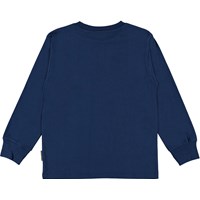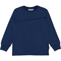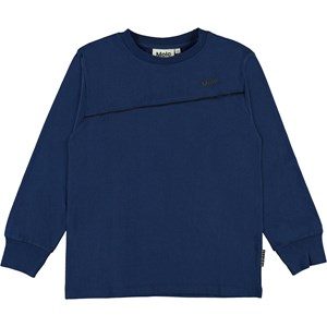 Rasmono is Molo's new, must-have basic top with long sleeves. The top is blue, has a round neck, a logo and an asymmetrical stripe on the front.