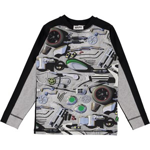 A print of motorcycle parts is on the front of the Raso top. Raso has two different coloured sleeves, one in grey and the other in black. It has a black back.