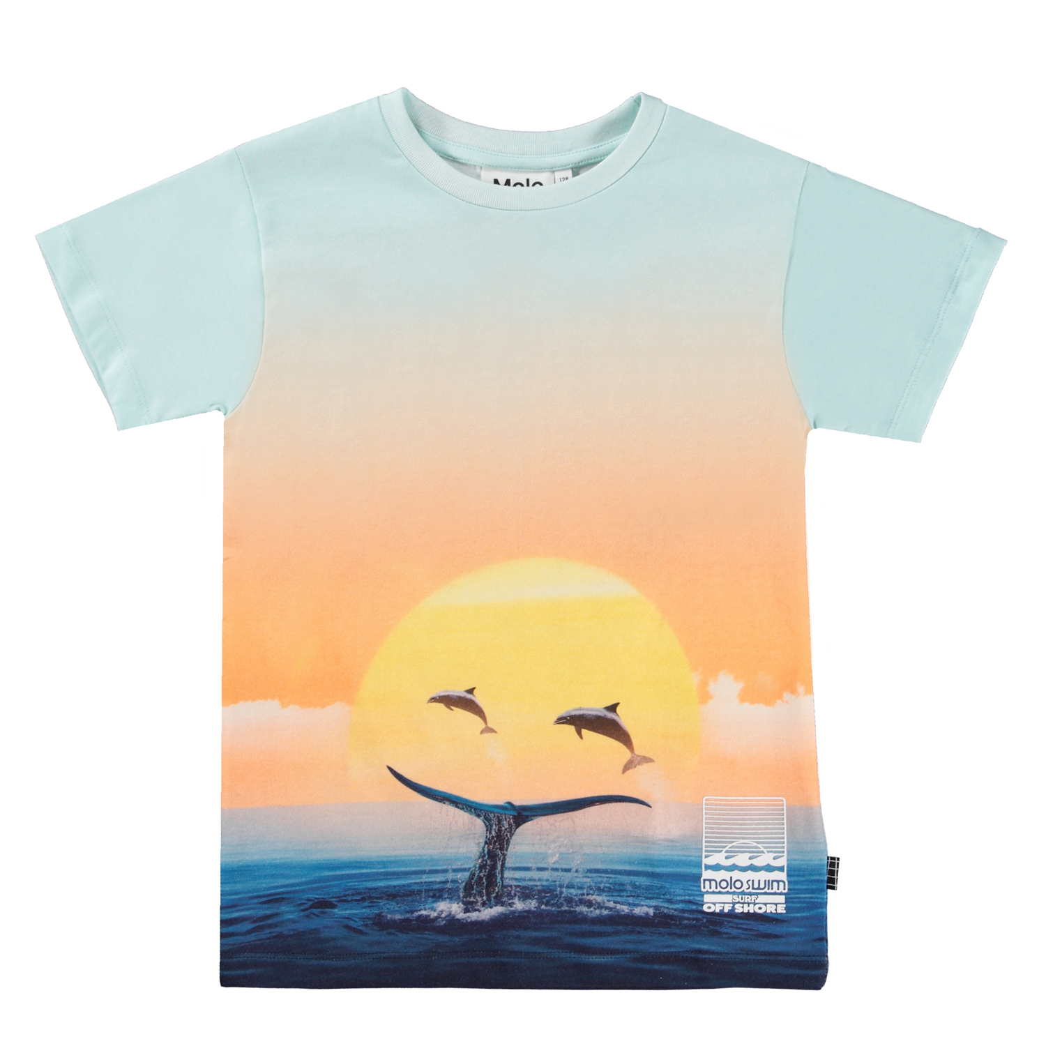 T-shirt in 100% organic cotton with a placement print in shades of blue and orange. The print is of a sunset over the ocean, where a whale's tail forms a smiling face with the help of two playful dolphins. The print continues on the back and has a humpback whale throwing itself into waves. The t-shirt has a round neck with a rib edge and is in a regular fit.