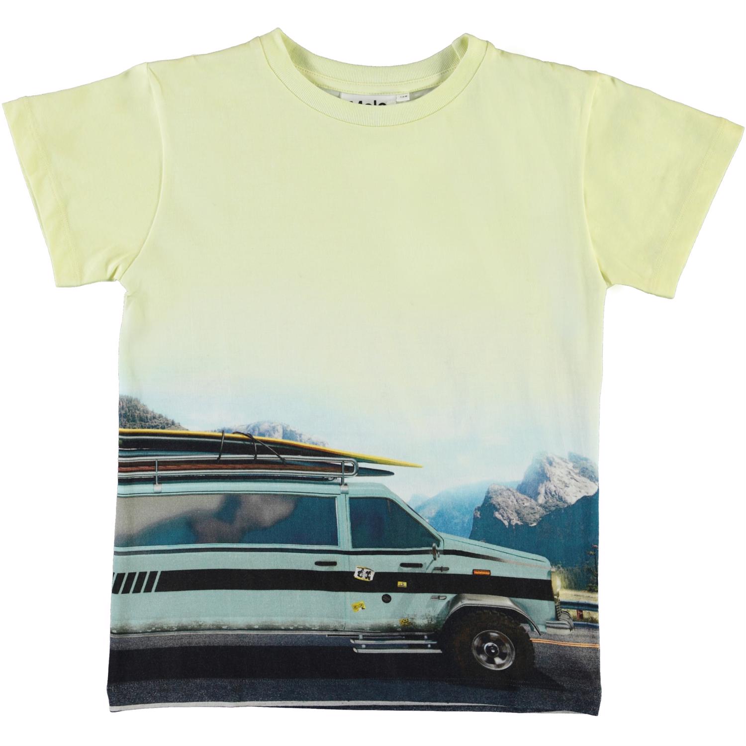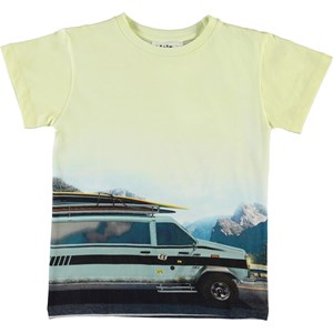 Surfboards have been mounted on the roof of a car, and everything is set for a road trip on the yellow Raul t-shirt. If you want to join this adventure, just jump on board. The t-shirt is in 100% cotton and has roll up sleeves. Certified by Ecocert Greenlife, certification no. 197496.