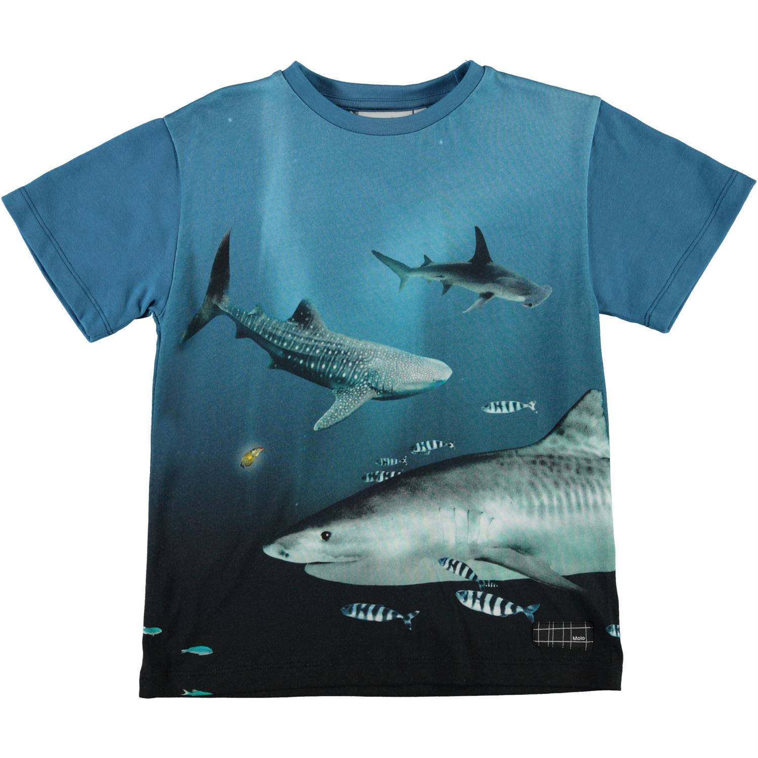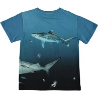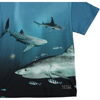 Raverno is a blue t-shirt with large sharks on the front. The t-shirt has a round neck.