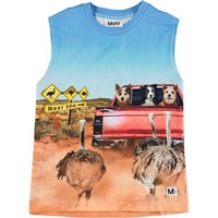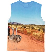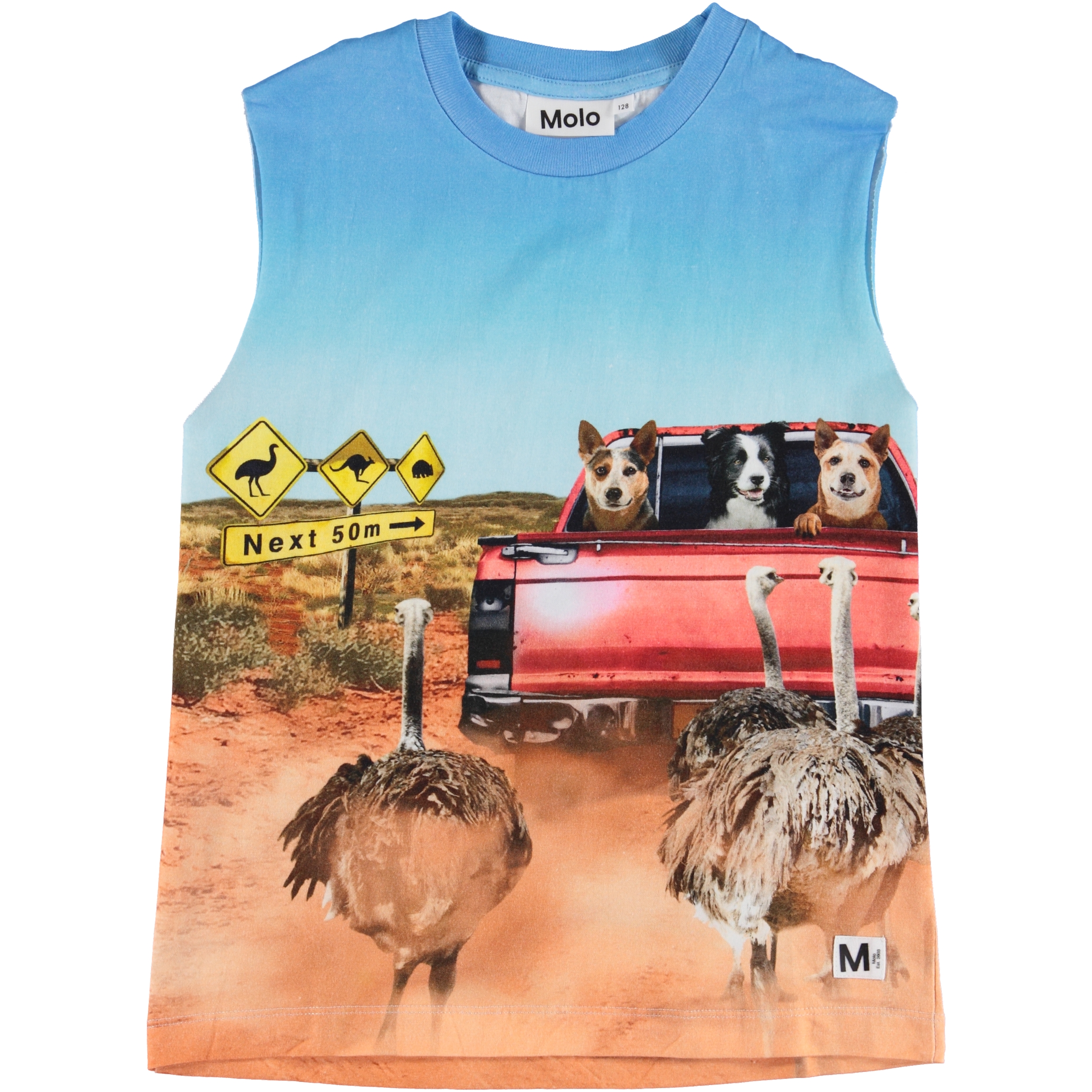 "It is all about exploration and adventure on the Ray vest. The front of the vest shows the 'In the Bush print' with three curious dogs in the back of a car, and the story continues on the back of the vest.