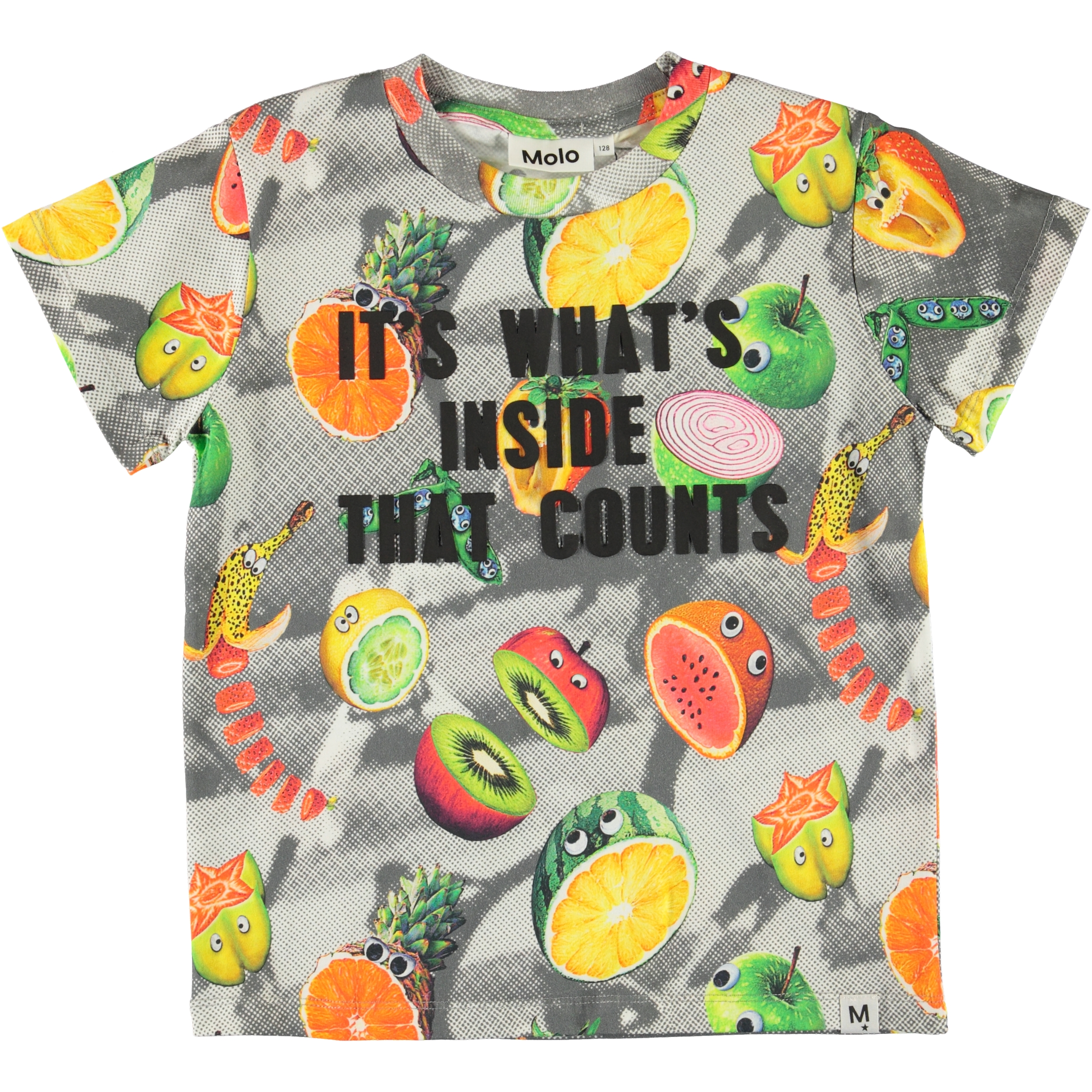 You don't always know what's hiding underneath the peel of a fruit. Take a look at these wonderful fruits on Molo's 'Karate fruit' print on the Raymont t-shirt.