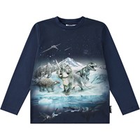 Dark blue top in organic cotton with long sleeves, round neckline, ribbed trim at the neck, and regular fit. It features a placement print on the front, where all the Dino friends are gathered in the snow by the cold water. Who do you think will throw the first snowball?
