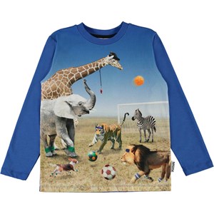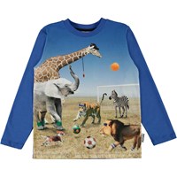 Join the animals of the savanna in a football match on the Reif t-shirt. The giraffe has the perfect overview and is therefore the ref. The top has long blue sleeves and a round neck.
