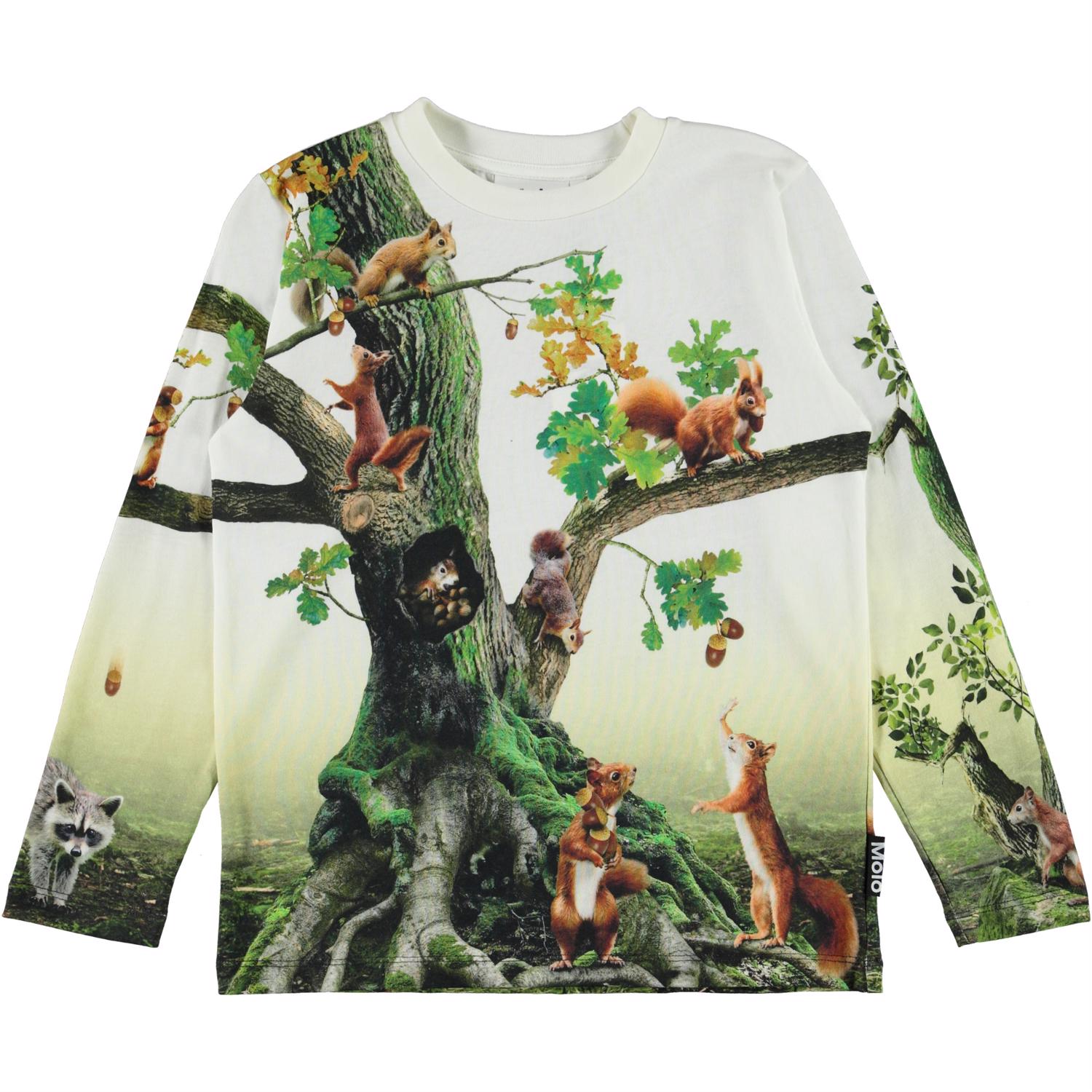Reif is a long sleeve white top with a print of a large tree with lots of squirrels and nuts. Squirrels love nuts and some of them have gathered a bunch and hidden them. Try to find the biggest stash on the print.