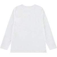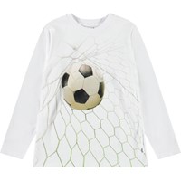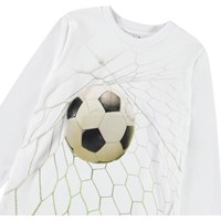 White long-sleeve top in soft organic cotton with long sleeves and ribbed neckline. The top has a loose fit with a front print of a football being kicked into the goal.