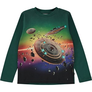 Green, long sleeve t-shirt with a UFO print on the front. There are UFO’s on this print that are flying faster than the speed of light. Watch out for all the hazards out there. You have to be a skilled alien in order to successfully navigate the asteroid belt. The print is in clear rainbow colours. This long sleeve t-shirt is constructed in 100% cotton and has a round neck and a regular fit.