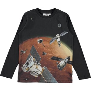 Reif is a long sleeve black top with a print of satellites that are flying around in space.