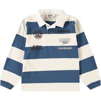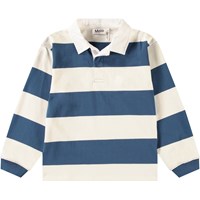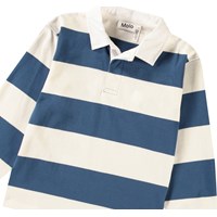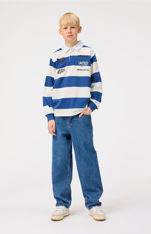 Broad-striped blue and white rugby shirt in soft organic cotton. The shirt has a regular fit, long sleeves with ribbed cuffs, a white shirt collar, and a small button placket with three hidden buttons, making it easy to put on.
