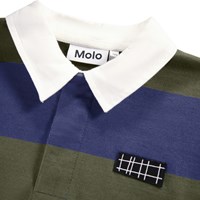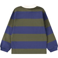 Wide striped blue and dark green rugby shirt made of soft organic cotton. The shirt has a regular fit, long sleeves with ribbed cuffs, a white shirt collar and a small button placket with three hidden buttons, making it easy to put on.
