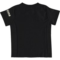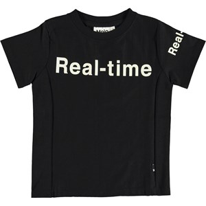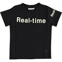 Rem is a slightly fitted cotton t-shirt in black with a "Real-time" white print over the chest and left sleeve.