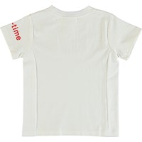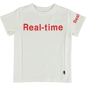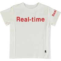 Rem is a slightly fitted cotton t-shirt in white with a "Real-time" red print on the chest and on the left sleeve.