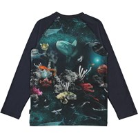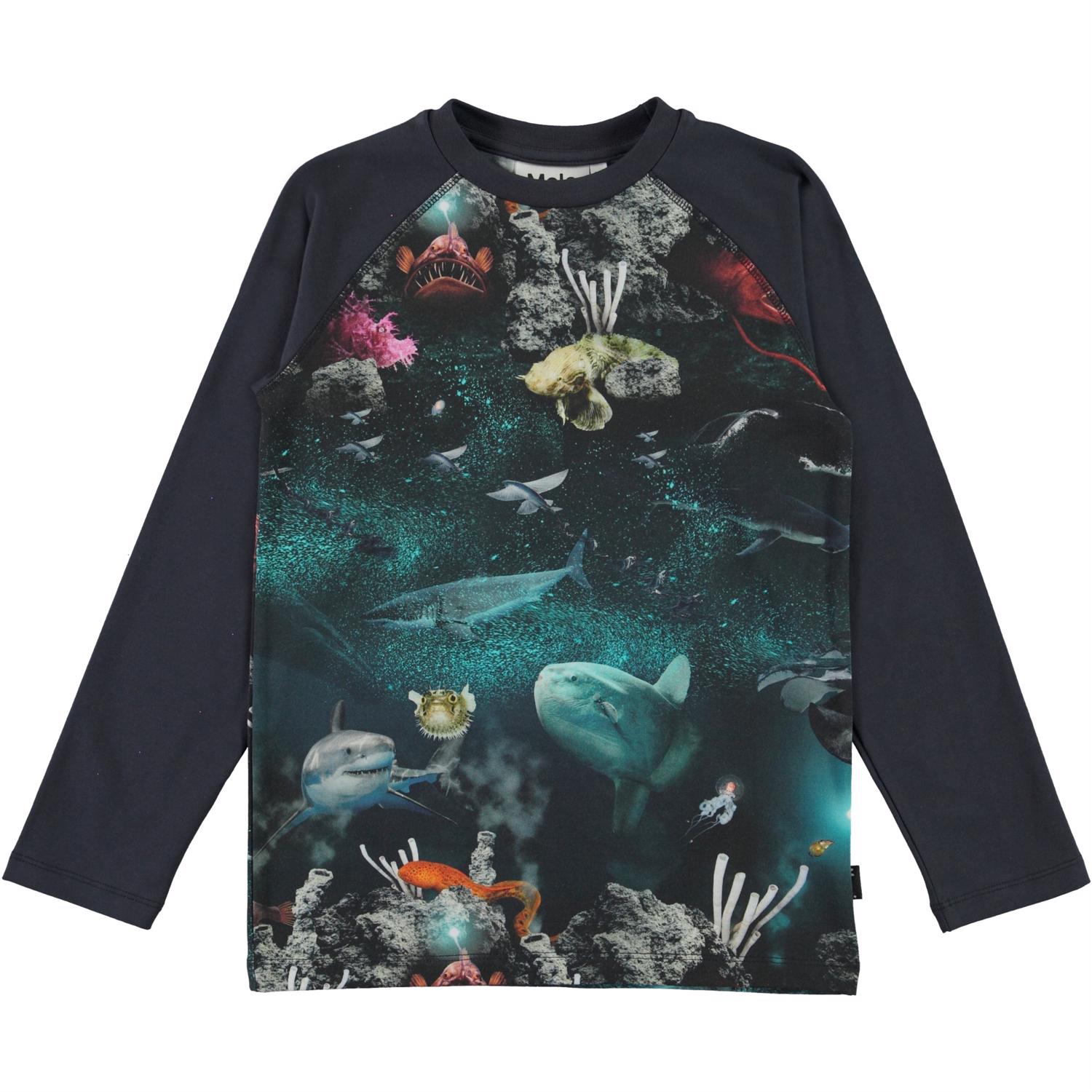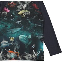 Dive under the ocean's surface and see what's hiding in the print on the Remington top. There are many different fish and maybe a shark. Remington is a long sleeve top with raglan sleeves.