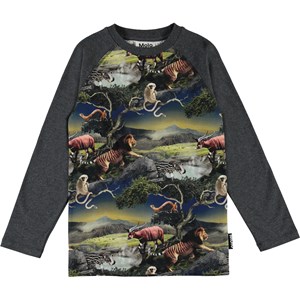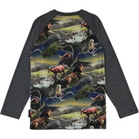 We have travelled into the future in the 'Future Animals' print on the long sleeve Remington t-shirt. The animals no longer really look like themselves. Remington has dark grey raglan sleeves.