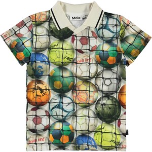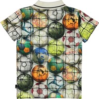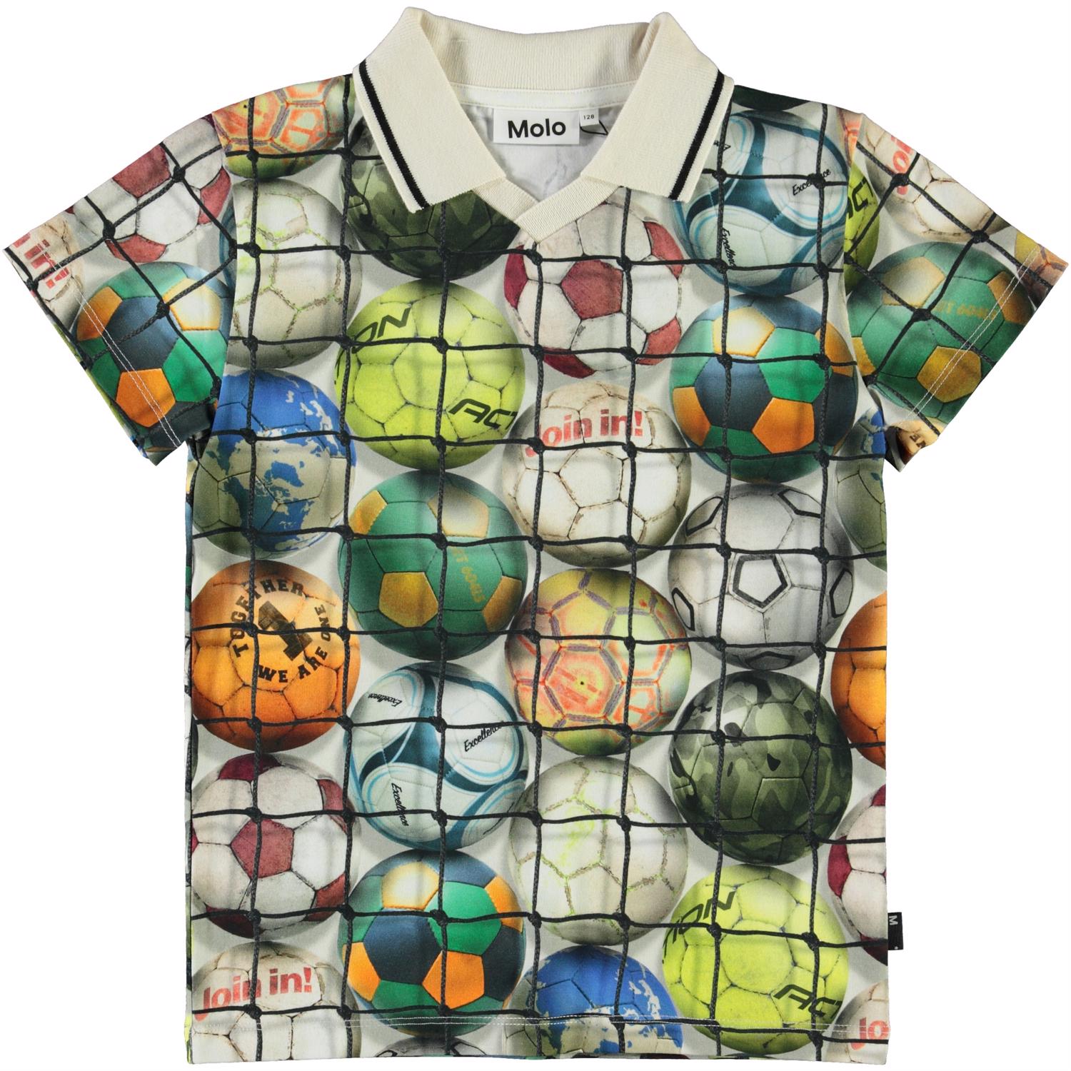 Ren is a polo t-shirt with a print of footballs. The polo has a white collar with a black stripe.