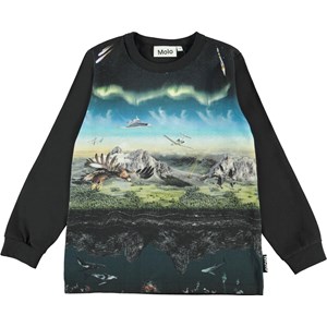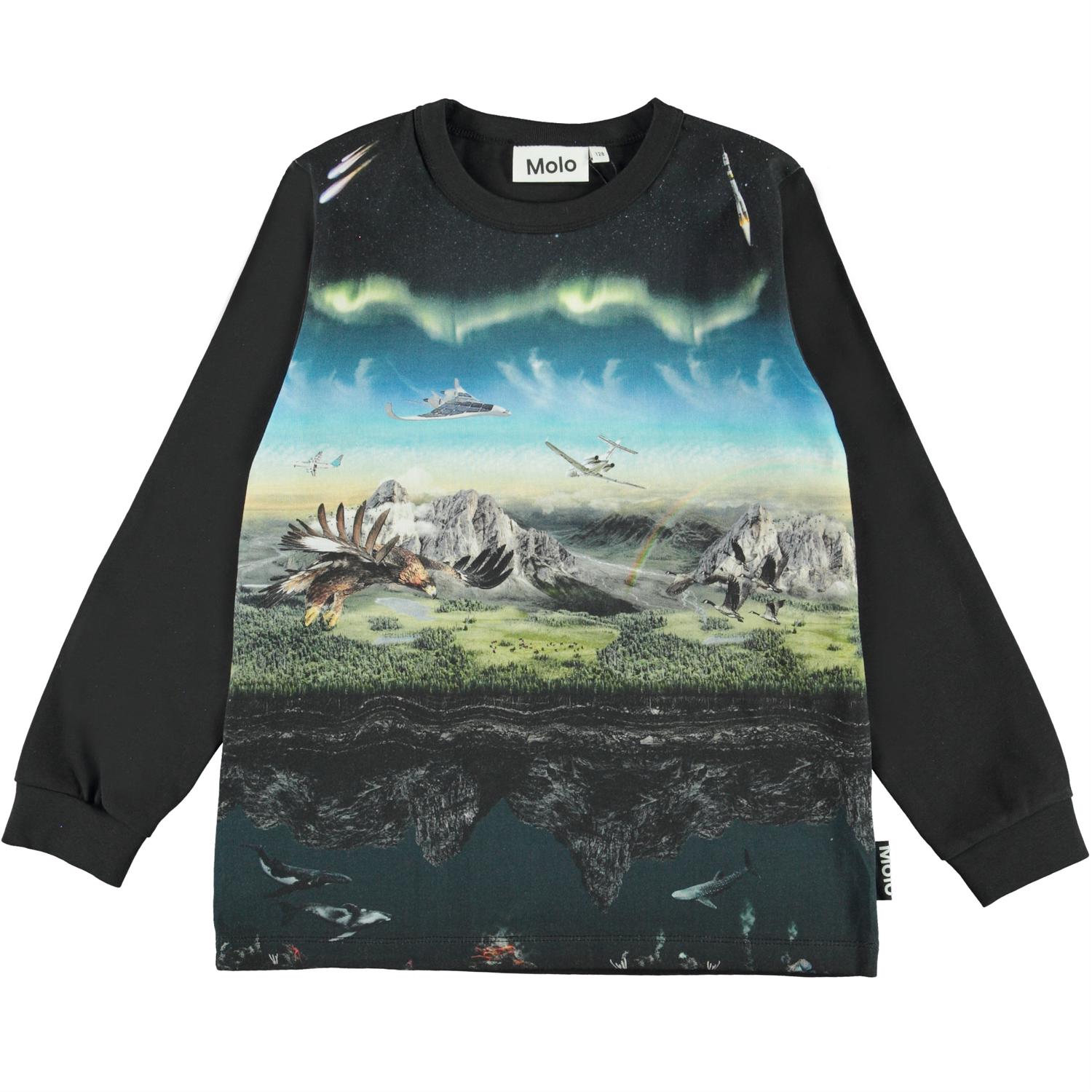 Rez is a long sleeve black top with a print of a futuristic airplane and eagles that are flying over cliffs.