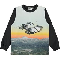 Rez is a black top with a print of a flying car that is flying over mountains in the sunset.