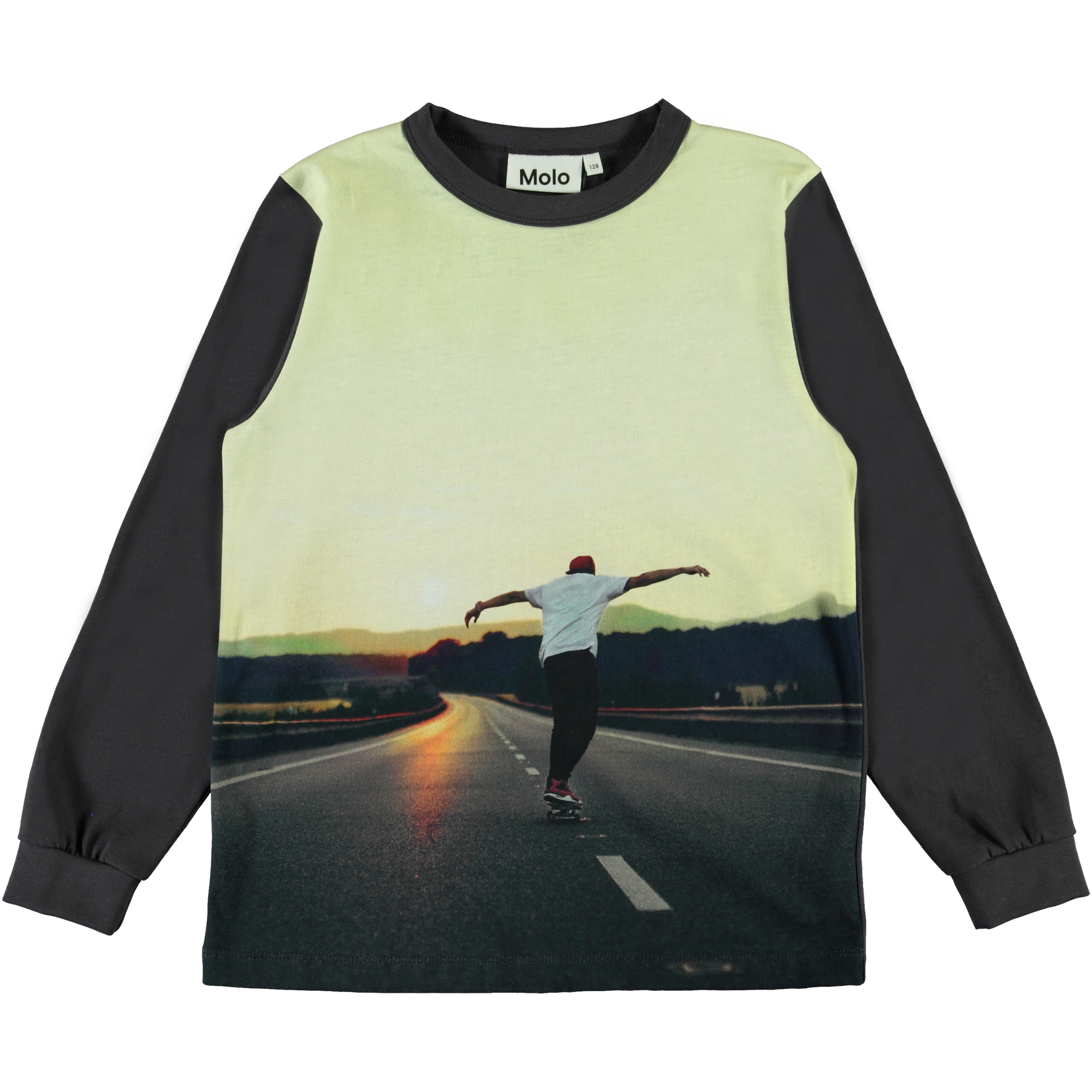 Rez is a dark grey top with a skater print on the front. Find your skateboard and join the fun!