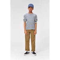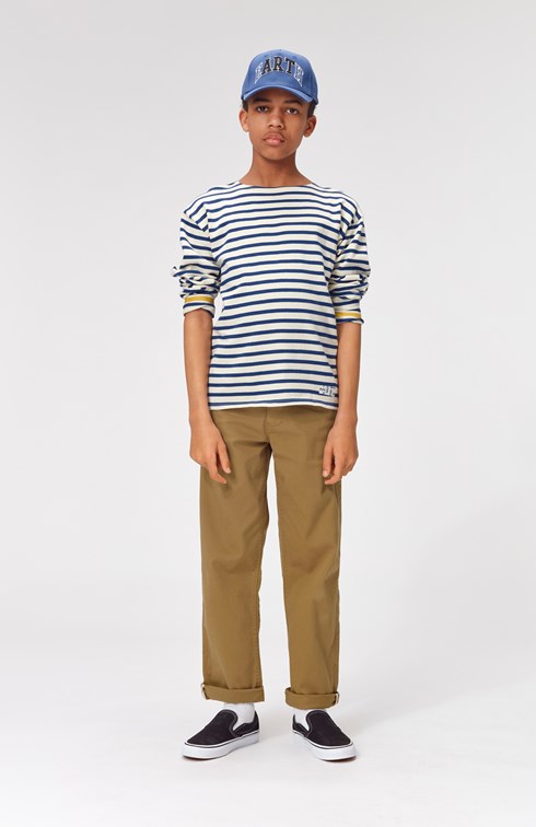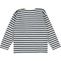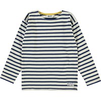 Rilder is a long sleeve t-shirt in blue and white breton stripes. There is a sewn on label at the bottom left side.