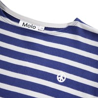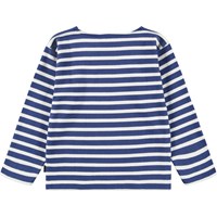 Breton striped blue and white long-sleeved top made of soft organic cotton with long sleeves and internal tape at the neckline. The long-sleeved top has a loose fit with a small embroidered peace sign on the chest.