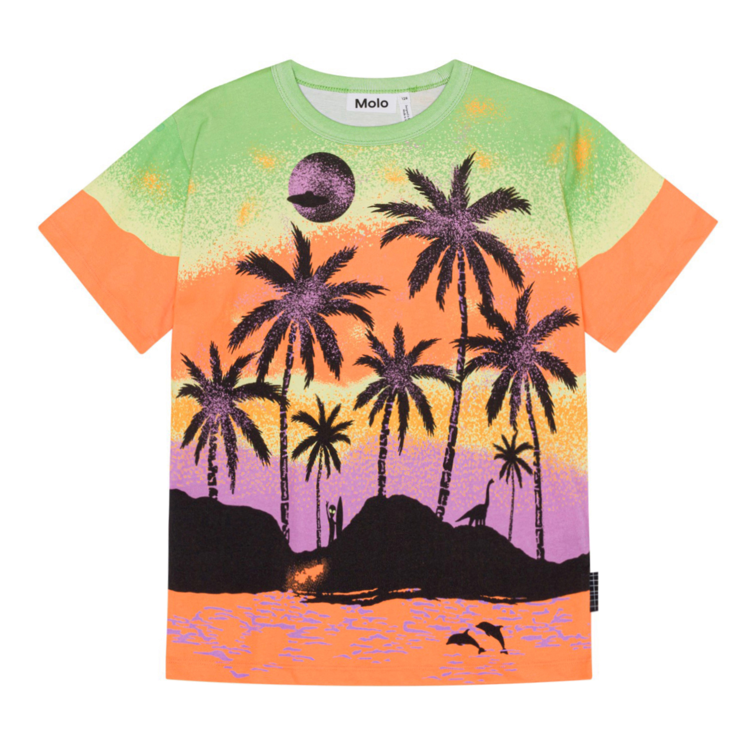 Riley is a t-shirt in 100% organic cotton with an alloverprint. It's a classic Hawaii print with a twist, with palm trees and a sunset in shades of black, orange, green and purple. Can you spot a surfer alien or other guests? This t-shirt has a round neck with a rib edge and a loose fit.